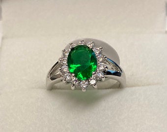 This classic exemplifies timeless design, mingling comfortable wearability with the look of luxury. Rhodium-finished brass ring features beautiful emerald green and clear cubic zirconia. These synthesized luxury gemstones emulate numerous mineral qualities of natural diamonds and gemstones.