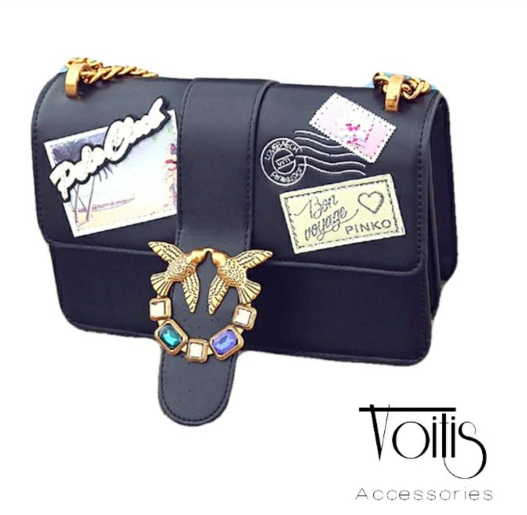 Our own unique brand of handbags call Voitis accessories. Design with help of a great team. Post card and stamp details on the front of the bag great for travel lovers.