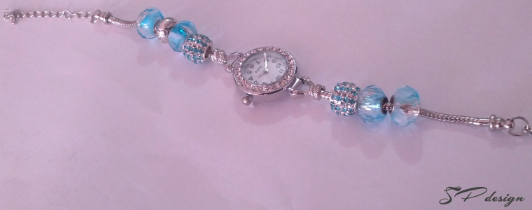 This Pandora style watch bracelet was created using two silver chain bracelets which are connected to a Quartz watch face. Each side of the chain bracelet is emblished with antique silver joy beads, Blue AB faceted rondelle beads and chanton crystals. The fun think about this watch piece is that you are able to purchase and continue to add more rondelle beads if you like or simply swap different colour beads to match new outfits.