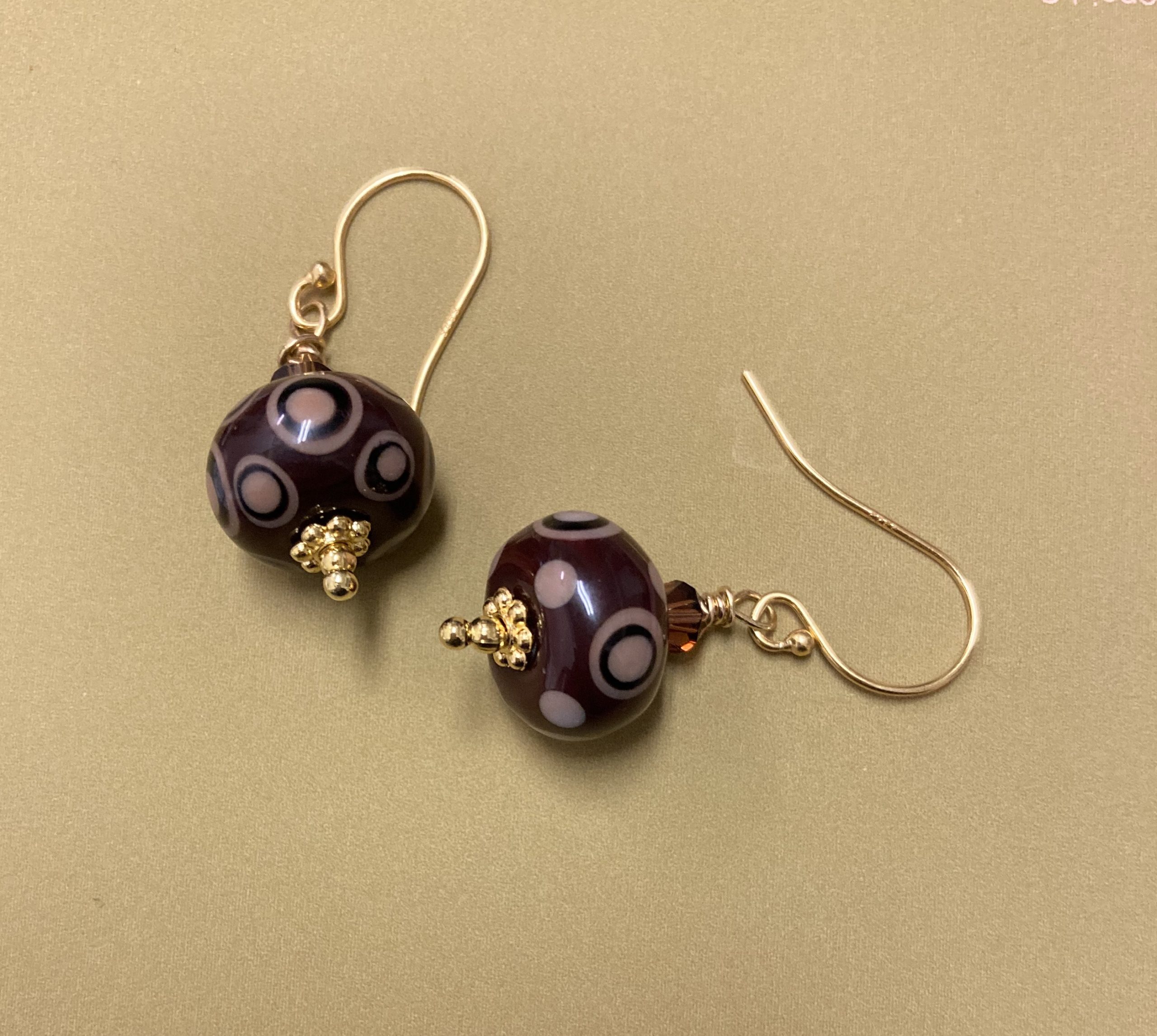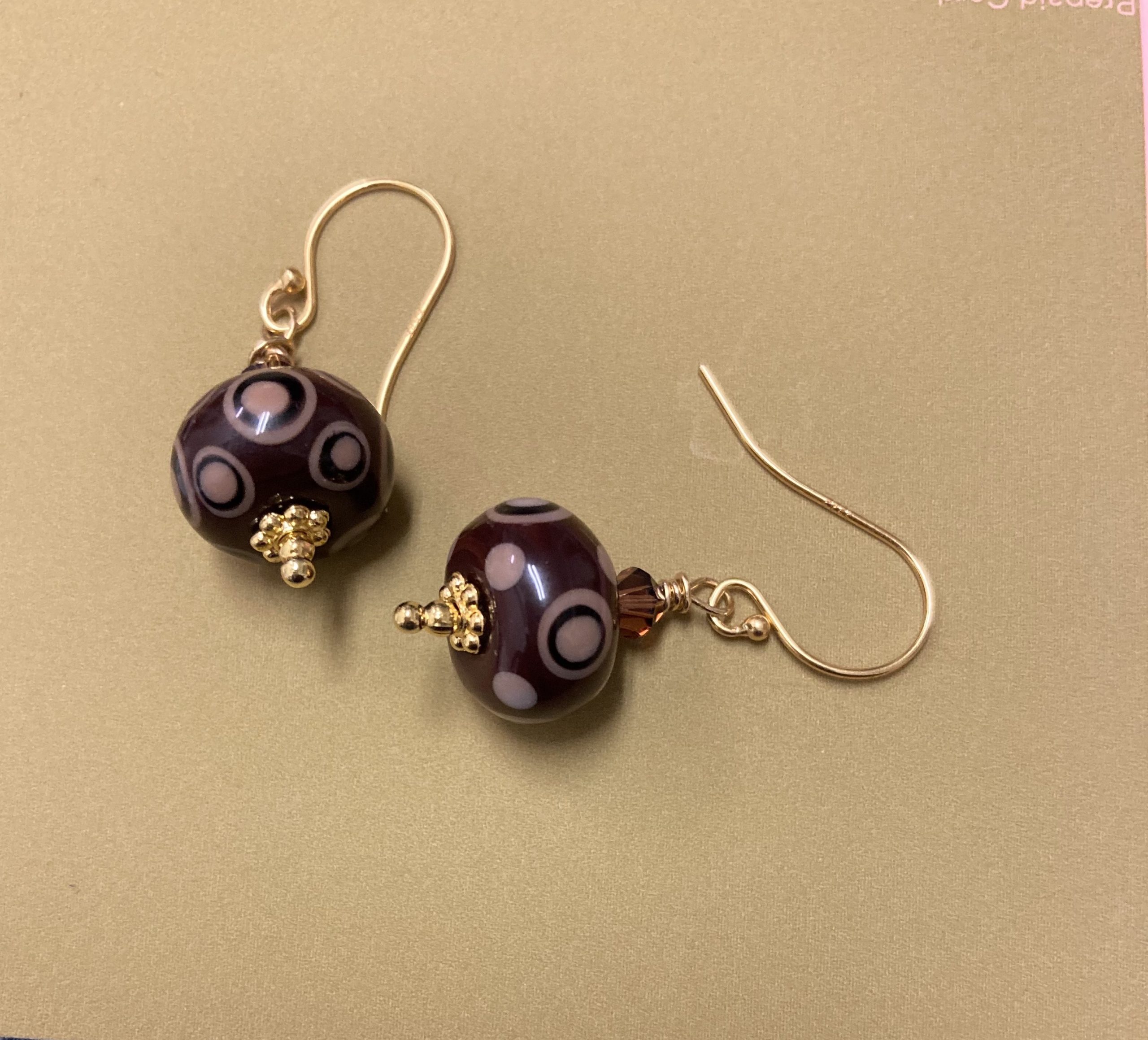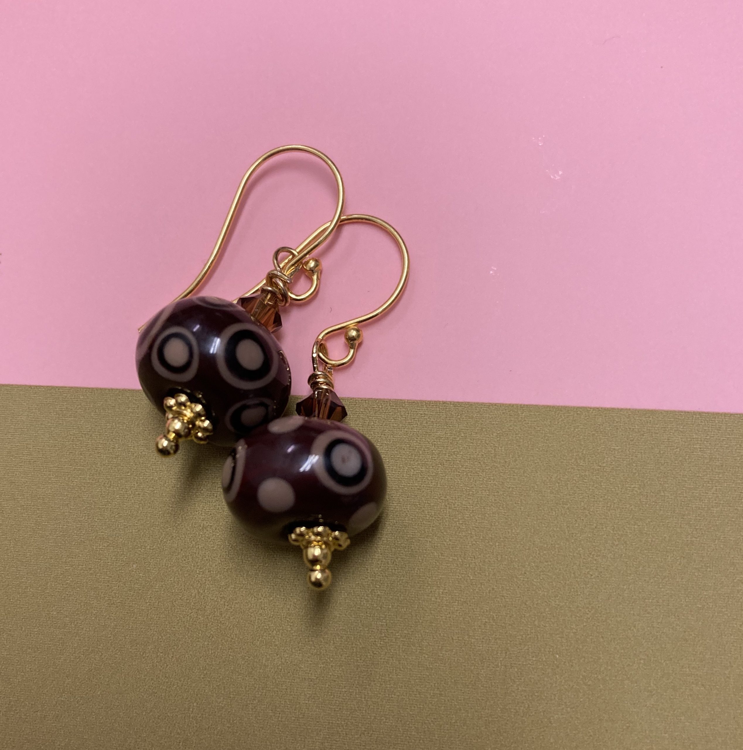 Chocolate and caramel mix handmade lampwork roundel earrings. The pieces are embellished with 4 mm smokey brown crystal bicones, gold daisy spacers and tiny round gold beads. The earrings hangs from two fancy 24k vermeil Gold fish hook earwires.