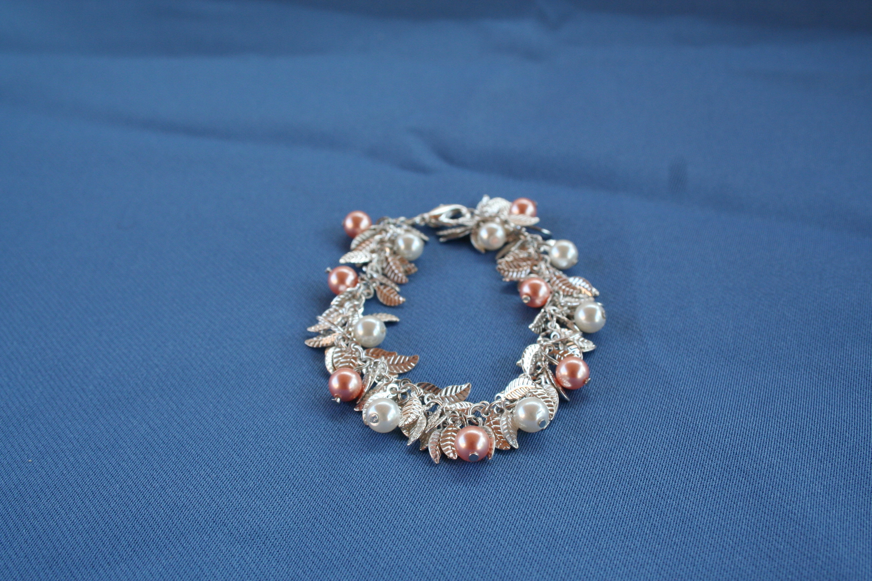 This stunning bracelet was created using a silver plated chain , with leaf charms, and dressed up with white and rose peach 6 mm Swarovki pearls. A silver lobster clasp was used to connect , a perfect closure!