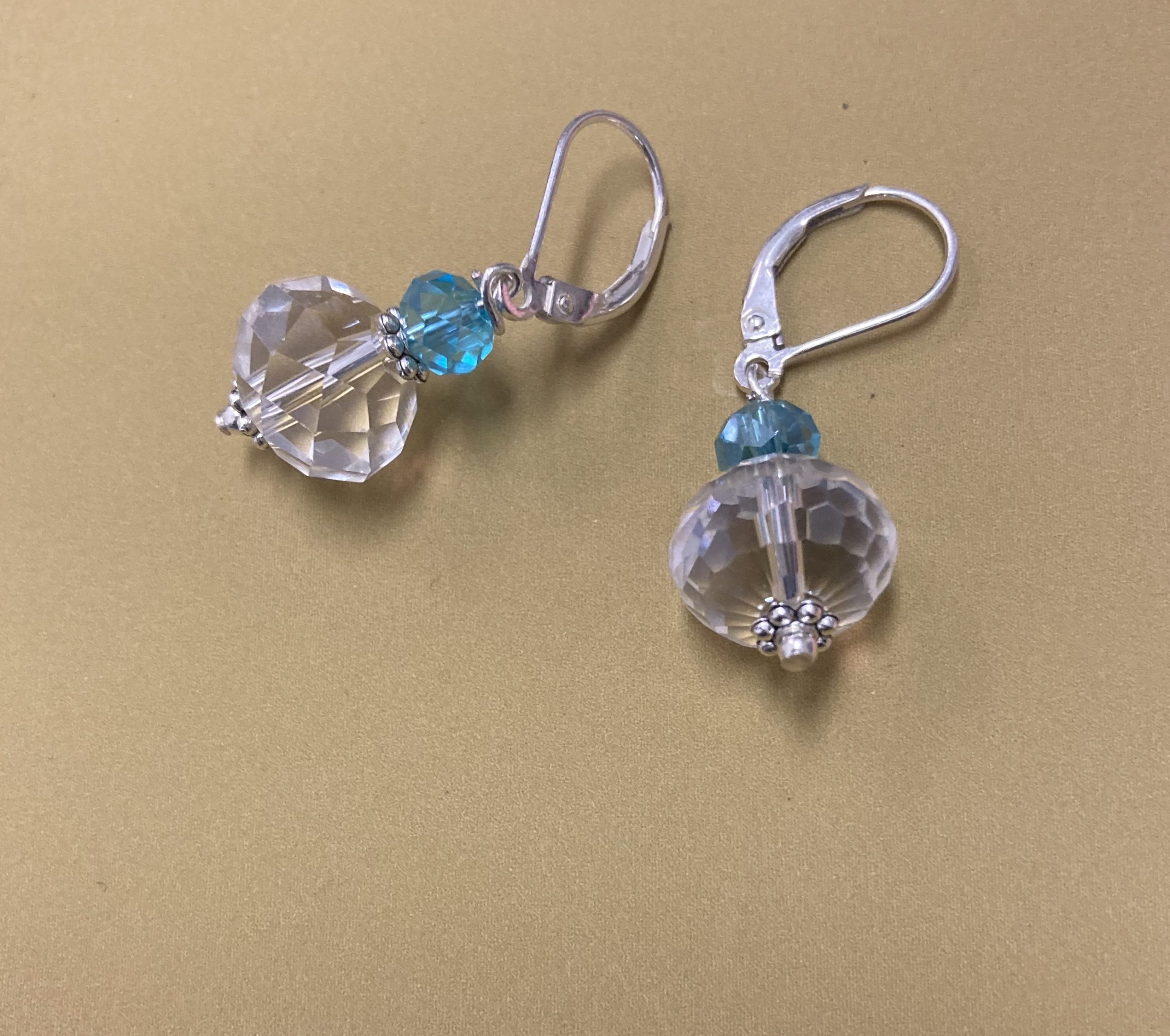 Beautiful earrings featuring 12×8 mm faceted crystal roundels. These are topped by 6mm sky blue AB faceted crystal roundels. Each crystal is separated by a 4mm silver daisy spacer beads and 2mm silver tiny round beads. These earrings hang off two fancy 925 sterling silver leverback earwires.