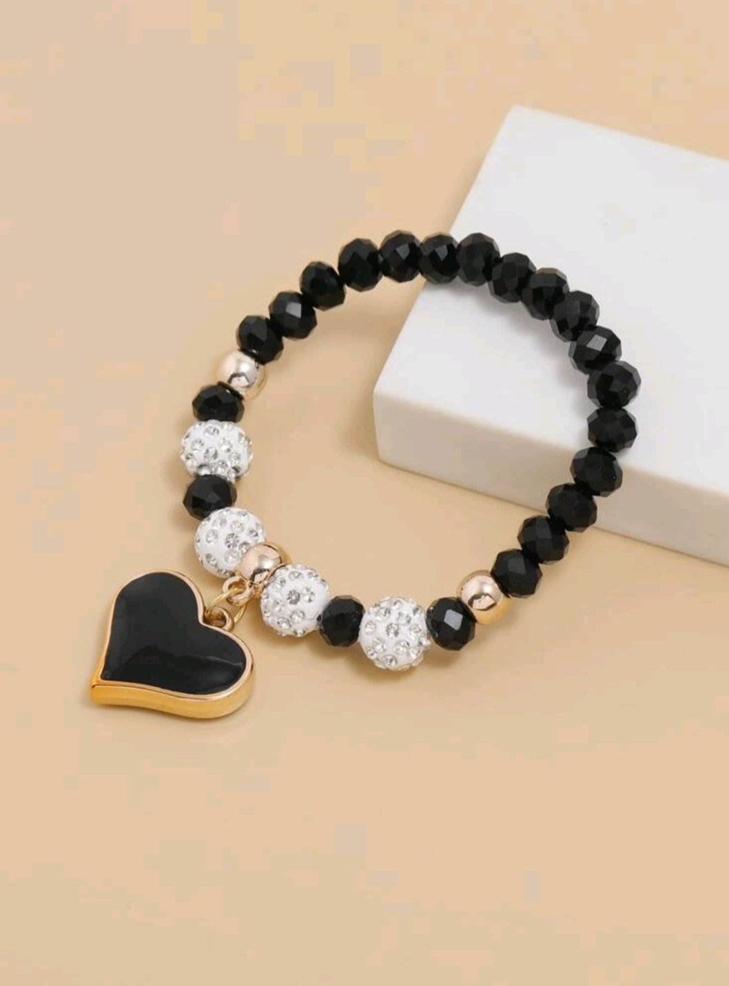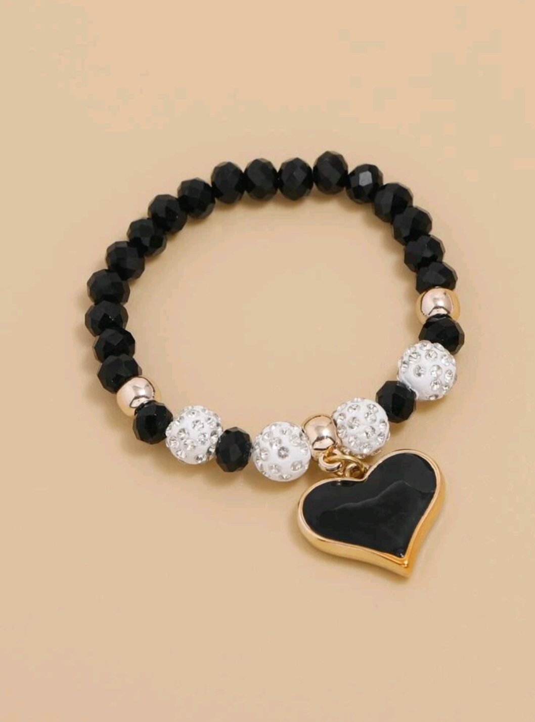 This bracelet is made with 8 mm white pave crystal beads, and 6 mm black Czech rondelle on a clear stretch string. The black and rose gold colour heart shape pendant add a touch of elegance to the bracelet . It’s about 7 inches long but can stretch to fit just about any wrist size.