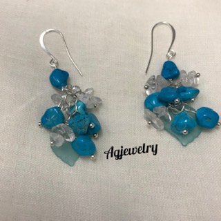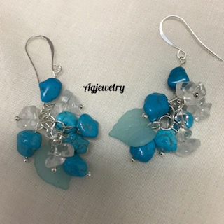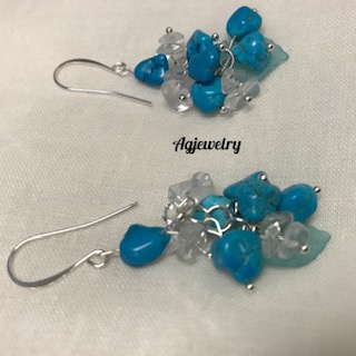 These earrings are truly gorgeous. A combination of Turquoise blue hand cut nuggets and natural quartz crystals, embellish with Swarovski clear crystal biocones and heart leaf pendants. These are all attached to silver French hook earwires.I wanted to create something that would look pretty and dressy for a big event, yet also be worn day to day. Looks even prettier than photo was able to capture.